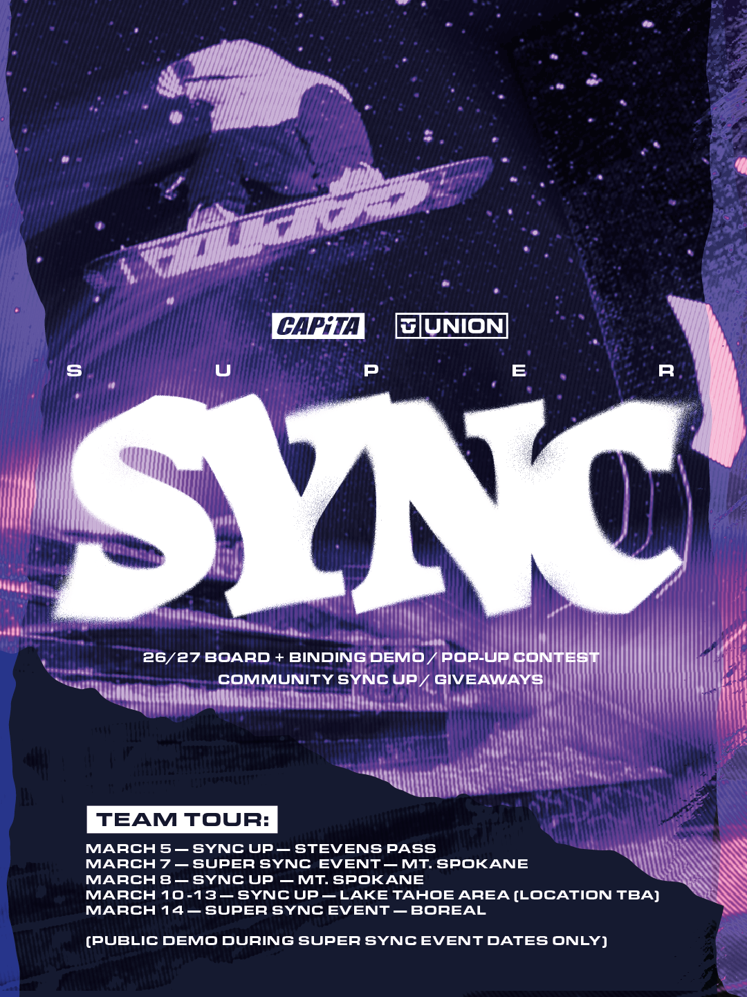 SUPER SYNC is here! We're pulling up to your resort to ride with the community and offer a free public demo of 26/27 CAPITA snowboards & Union...